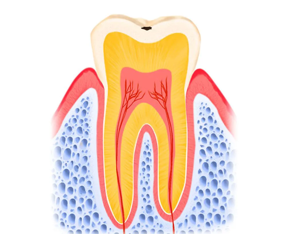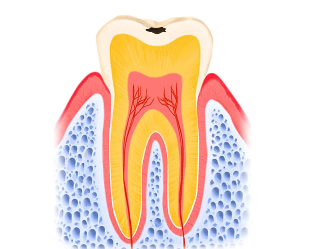 象牙質の下には歯の神経があるため、飲み物・食べ物の熱で痛みやしみる感じがするようになります。進行して神経に近づくと、さらに痛みを感じやすくなっていきます。