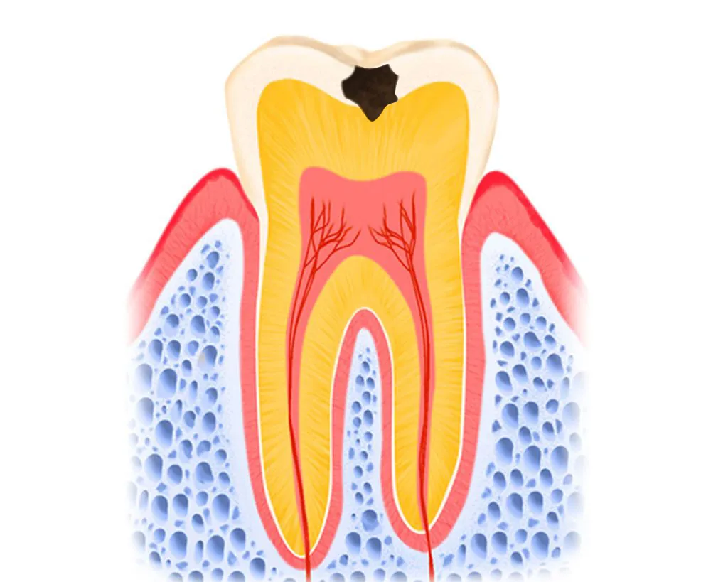 むし歯菌が作った酸によって歯の表面のエナメル質が溶かされ、さらにその下にある象牙質まで達した状態です。この段階になると歯に穴が開くため、目立ちやすくなります。