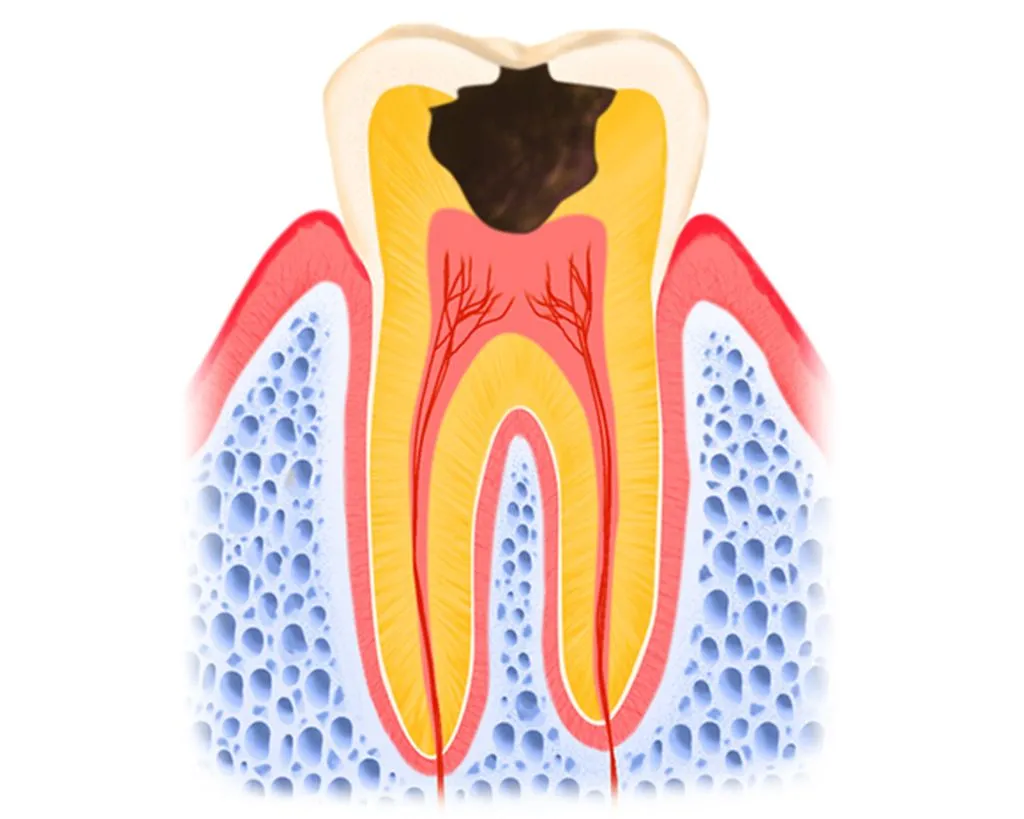 むし歯菌が作った酸によってエナメル質・象牙質が溶かされ、その下にある歯髄(歯の神経)にまでむし歯が進行した状態です。大きな穴が開くためむし歯だとひと目でわかります。