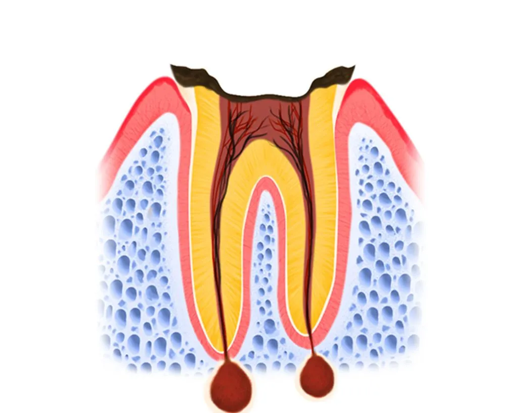 歯の神経はむし歯菌に侵されて死に、痛みはなくなります。同時にむし歯は悪化し続けて、歯根の先に膿がたまる、歯ぐきや顔に穴が開く、全身疾患を起こすなどの症状が起こります。