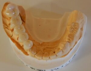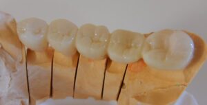 ↑こちらはジルコニア単体で仕上げたブリッジ。強度が必要な大臼歯をカバーするブリッジもジルコニアなら金属を使用することなく作成できます。